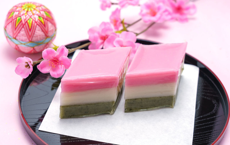 菱餅の色は桃(赤)色、白色、緑色です。それぞれくちなしの実、菱の実、ヨモギで着色されます。
